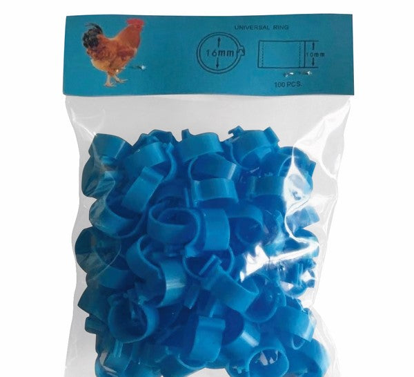 Blå benringar för höns, 16 mm i diameter, levereras i förpackning om 100 stycken. Dessa benringar används för att enkelt identifiera och hålla ordning på höns i flocken, till exempel för att skilja på ras, ålder eller produktionsgrupper.