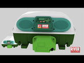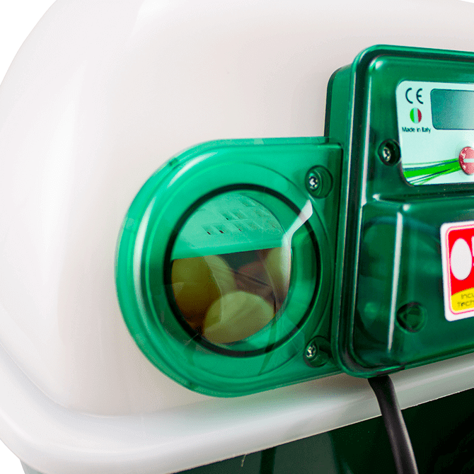 Maskinen är utrustad med inspektionsfönster för att följa inkubationens alla faser och en svängbar äggbricka som rymmer både små och stora ägg, inklusive gåsägg. En plastbotten ingår för att lägga äggen tre dagar innan kläckning. Effektiv och användarvänlig, perfekt för både hobbybruk och små gårdar.