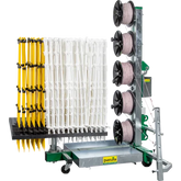 Med justerbar broms för trådspänning vid uppsättning, och elektrisk motor med styrarm vid nedtagning, rullas materialet automatiskt upp jämnt och säkert. Den robusta konstruktionen med 3-punktslyft gör att maskinen enkelt monteras på traktor, samtidigt som det praktiska chassit gör det smidigt att manövrera även för hand när maskinen inte är inkopplad.